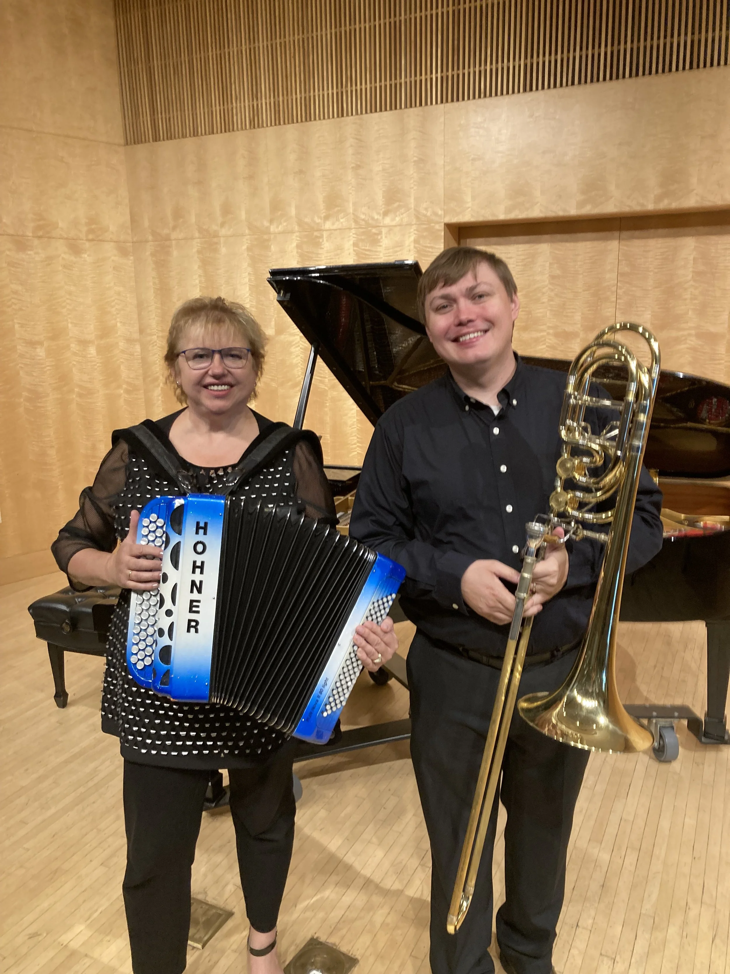 Recital Description: The TromboKordion Duo will present a recital of new compositions and arrangements for bass trombone and accordion. TromboKordion Duo formed in 2022. This unique duo is comprised of bass trombonist, Lucas Kaspar and accordionist, Elena Fainshtein. The primary focus of this unique ensemble is perform new works for this eclectic instrumentation. The ensemble hopes that many more people will discover the vast versatility of the accordion and how rewarding it can be to perform with this instrument as a trombonist. The accordion can play with the technique of the piano, while playing with the lyricism of a great singer!